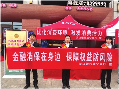 为深入推动金融消费者宣传教育,积极履行保护消费者权益责任,在3·15消费权益保护日来临之际,汉口银行咸宁分行与咸安市市场监督管理局联合开展“3.15消费者权益保护宣传进商圈”活动。