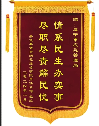 “尽职尽责解民忧,情系民生办实事。”日前,嘉鱼县楚南烟花爆竹批发公司向市应急管理局送来了一面锦旗,感谢该窗口工作人员细心、用心、暖心的服务。