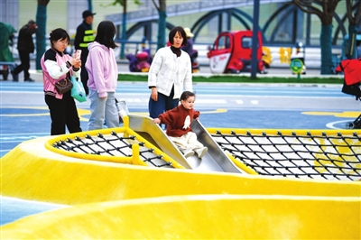 3月21日,天气晴好,咸宁城区桂花广场运动公园,家长带着孩子尽情游玩打卡。