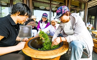近日,嘉鱼三湖茶麻专业合作社茶园喜迎武汉和嘉鱼两地30多名采茶游客。这是蓝城春风田野小镇组织的“春游团”,老老少少背篓采茶自得其乐,还在制茶师傅指导下,亲手杀青炒制后直接将各自制好的新茶带回家。