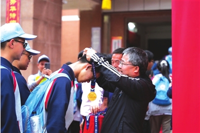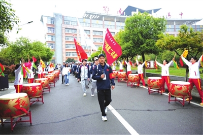 7点25分,在铿锵有力的战鼓声中,22个班、1500多名师生和随行家长迈着矫健的步伐走过出征门。