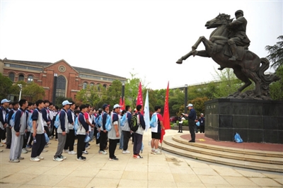 14点10分,经过午间短暂的休整,同学们继续向终点行进。途经叶挺广场,远足队伍在叶挺将军雕像前敬献花篮,举行了庄严肃穆的瞻仰仪式;来到梓山湖航天科技馆,同学们现场学习了航天知识,更坚定了努力学习、科技报国的信念。