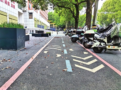 为了解决上下学高峰期人车混行及交通拥堵问题,市项目局对沿街路面进行充分利用、功能分区,将行道树下设置为非机动车停车区,规范学生家长及周边停车。同时将人行道划分为双向,让行人流动更为顺畅。