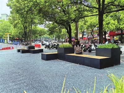 彩色的地面上绘制着清晰的标线,云朵形状的休憩亭和花箱式座椅组成休闲空间,路边非机动车整齐停放……4月8日,在市第五小学门口,记者看到了新建成的街角花园。