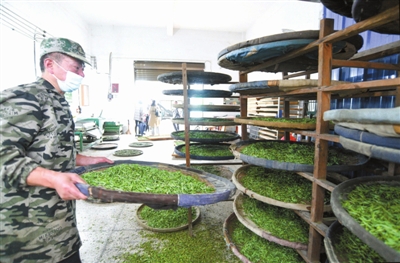 4月2日,咸安区贺胜茶叶大市场茶香扑鼻,18家制茶车间机器轰鸣,制茶师傅忙着制茶。