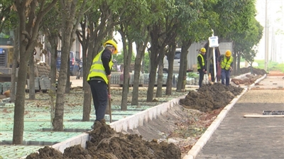 当天,记者走进杨排洲村整治建设现场,看到工人们正抢抓晴好天气对人行道铺设彩砖、道路进行绿化等施工作业。村口处整齐的人行道及道路绿化已处于收尾阶段,村湾中心地带建设了文化广场,广场旁的文化墙上描绘了美丽的乡村图画。