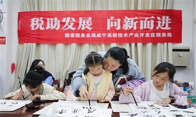 活动中,市税务局办公室副主任刘新明(湖北省作协会员)讲授了《如何引领孩子阅读国学经典》,引导少年儿童走进阅读的世界;市税务局机关工会主席(中国书法家协会会员)覃修毅现场挥毫泼墨,“写廉字 传廉意 树廉心”,为小朋友讲授毛笔书法技巧;税务干部化身小老师,开讲税法小课堂,普及税法知识;孩子们身着汉服一起朗诵《三字经》经典段落,感悟中华优秀传统文化的魅力;现场还通过图书分享、亲子共读、为农家书屋捐书等环节吸引了大批居民前来参与,呈现出一幅书香弥漫的场景。
