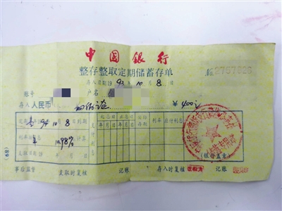 柜员接过存单,仔细端详这张存折,发现存单日期比自己年龄都大,但存单上面抬头“中国银行整存整取定期储蓄存单”“户名:舒**”“业务办理日期:1993年10月8日”“利率按年息10.98%计算“等字样清晰可见。