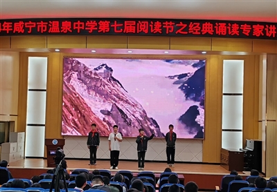 4月23日,温泉中学学术报告厅座无虚席,由湖北科技学院师范学院常务副院长兼语委办主任孙和平主讲的《经典诵读》讲座正在进行。现场气氛热烈,孙教授讲解朗诵概念,演绎朗诵技巧,带领学生感受朗诵的魅力。同学们积极参与互动,或独诵《木兰辞》,或齐诵《声声慢》。