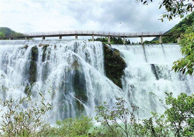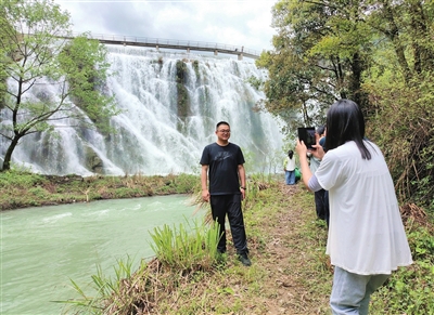 4月20日,通山县厦铺镇三宝村芦坪湾的鹅公颈水库水量充沛,水流奔涌而下,形成壮观的大瀑布,吸引各地游客前来“打卡”。