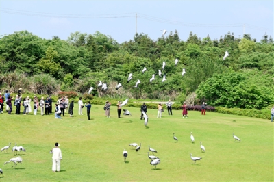 4月23日,咸安区贺胜桥镇黎首村的仙鹤湖湿地园鹤舍,鹤群飞上蓝天,在青草地上方盘旋,吸引众多游客纷纷拍照、录影;随着鹤群降落,游客近距离观鹤。