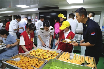 “咸宁舰是我们流动的国土!希望咸宁舰乘风破浪,守护祖国海疆!”11岁的小学生朱珈诺将精心准备的礼物——以咸宁舰为主要元素创作的绘画作品《乘风破浪》送给海军叔叔。万子徵、吴万宁同学充满自豪地朗诵《少年中国说》,表达对咸宁舰官兵的敬意。拥军代表刘红琳、应俊为咸宁舰官兵赠送慰问物资。