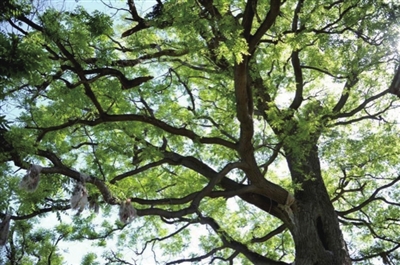 我拿出手机试图拍下它的宏伟,试了几次却无法完整清晰地把它拍下来。古树开枝散叶,太高太宽敞,只好选一个角度,拍下它一边的浓枝。