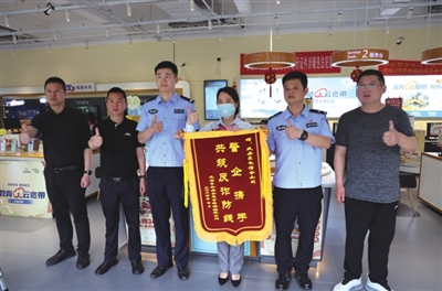 4月28日,咸安区公安分局官埠桥派出所将一面印有“警企携手 共筑反诈防线”的锦旗送到中国电信股份有限公司咸安分公司员工手中,对该公司员工及时举报疑似诈骗行为,避免违法犯罪活动的行为表示感谢。
