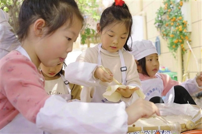 “其实除了做美食,我们幼儿园小朋友学的劳动本领有很多,比如养家禽、编织、缝纫、茶艺、水墨拓印等。”徐海路幼儿园园长张乾介绍,孩子们的劳动以自我服务为主,还有手工类、生活体验类等。
