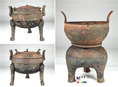 据介绍,北一、二室被盗扰严重,仍然提取出600余件(组)器物,多数为琴瑟等弦乐器,出土的编钟架横梁保存完整,上有悬孔14处,与追缴的青铜编钟数量吻合。南一、二室出土漆盒、耳杯、盘、豆、鼓、玉璧、璜以及大量铜箭矢等。西一、二室遗物以漆木俑为主,还发现木车、乐器和少量遣策类竹简。东一室以青铜器为主,目前已提取青铜器150多件(组),青铜礼器组合保存完整。
