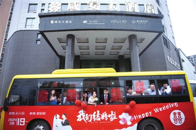 5月19日,咸安区车站路一小区,一场独特的婚礼吸引了众多市民的目光。新郎陈先生选择了一辆装饰一新的公交车作为婚车,20多人的迎亲队伍,在车上唱歌、玩游戏,气氛温馨而欢快,全程见证了一对新人的幸福时刻。(记者庞赟 通讯员牛钰皓)