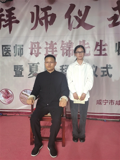 今年51岁母连锦,上世纪七十年代初出生于华佗故里——安徵亳州,自幼生活在老中医郭平坡姑父家中,受其的熏陶和影响,对学习中医尤为热爱。高中毕业后,他“金榜题名”,如愿考上了湖北中医学院。从此,他在中医海洋里博击风浪,自由翱翔。20多年来,他勤奋好学,不耻下问,曾拜鄂南名师王胜利、国医大师张大宁为师。通过不断拼搏努力,他创建了“咸安区南方中医门诊”这座中医“殿堂”,并多次荣获省、市、区授予的“优秀中医”“优秀医务工作”等荣誉称号,成为咸宁中医园地一名“大家”。此前,母连锦已收过3名弟子。目前,已学有所成,分别工作于相关中医岗位,服务于百姓健康。当天,母连锦所收之徒,名叫夏奥,湖北中医学大学学生,母连锦之所以收之为徒,是因为夏奥高中时代就认识了母连锦,受其影响,对中医十分热爱,并考取了湖北中医药大学,继续学习中医药知识。同时,还因为其父从商,与母连锦同为咸安区永安商会会员,对母连锦的医术、医德十分敬佩,羡慕不已。于是,在朋友的提议下,夏奥的父亲向母连锦表达了想将女儿夏奥拜其门下,学习中医知识意愿。对此,母连锦见其态度十分诚恳。于是,便答应收夏奥为“入门弟子”。
