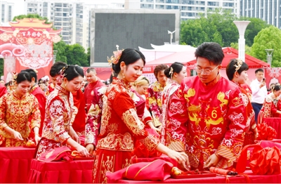 5月20日,在通城县银山广场,新人们正在参加集体婚礼。