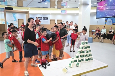 随后,工作人员带着大家开展了“奇思妙想”的科学秀,两名小记者用尽力气对着一座纸杯塔吹气,杯塔纹丝不动。一名工作人员为大家演示空气炮科学小实验,通过流体力学原理,从而产生巨大的威力,击落了杯塔。很多小记者踊跃参与体验,将空气炮对准叠了好多层的纸杯,利用气体的力量将杯子推倒。