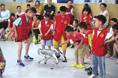 这边在专注比赛,另一边的科普讲堂现场,科技馆讲解老师展开了一场生动的科普讲座——《神奇的人工智能》。人工智能如何工作,工作的原理,这些专业的术语在卡通人物的演示下,浅显易懂。为了加深小记者们对AI的认识,工作人员现场带来了机器狗,只见它绕场一周向小记者打招呼,并表演了很多模仿宠物狗的动作,吸引了小记者围观。“你们可以试试,这只机器狗是推不倒的。”工作人员的介绍,立即吸引众多小记者体验,瞬时间,机器狗成了大家共同的宠物。