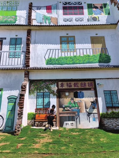 如何改造这面破旧的外墙,将其融入城市?市项目局邀请专业文创团队,4月份在这面3层楼高、140平方米的墙面上绘画。画上窗户、护栏、阳台、大门、小狗、裁缝铺、绿色邮筒等,这栋建筑内外充满了浓郁的生活气息,破墙摇身一变成景观。