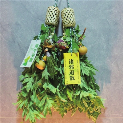 艾草代表招百福,是一种可以治病的药草,插在门口,可使身体健康。在我国古代就一直是药用植物,针灸里面的灸法,就是用艾草作为主要成分,放在穴道上进行灼烧来治病。有关艾草可以驱邪的传说已经流传很久,主要是它具备医药的功能而来,像宗懔的《荆楚岁时记》中记载曰“鸡未鸣时,采艾似人形者,揽而取之,收以灸病,甚验。是日采艾为人形,悬于户上,可禳毒气。”一般人也有在房屋前后栽种艾草,求吉祥的习俗。 (来源:成都发布)