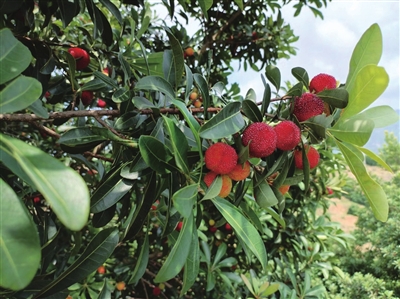 “年年梅里见诸杨,火齐堆盘更有香”。步入基地之中,颗颗杨梅如同粒粒圆润的珍珠挂在繁枝上,令人垂涎欲滴。红的如火,轻咬一口,一股微酸的味道涌上心头,有游客笑道:“这是孕妈妈喜爱的酸甜味”;黑的如墨,内行人说:“这是恰好熟透的果实”。一粒入口,鲜红的汁液酸中带甜,两粒入口,胃口大开,三粒入口,饥渴顿消。杨梅树上,紫色的、黄色的、白色的果实正向成熟赶场。