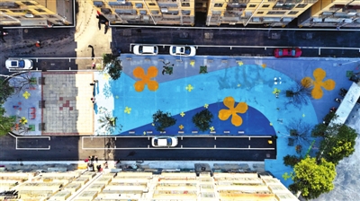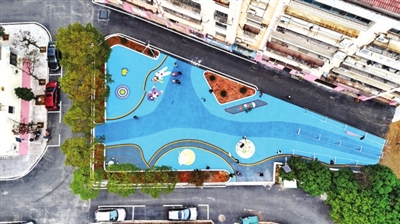 永安街道阳光社区的桂竹新天地小区于去年年底完成改造。小区广场颇具亮点。原先仅数十平方米的小型活动广场,拓展为面积500平方米的大型活动广场。广场上,深蓝、浅蓝、橙色、灰色交织的色块,配以桂花图案,既明艳又活泼,其中增添了一大批新健身器材。这里成为了居民休闲锻炼的首选之地,也成了孩子们的欢乐天堂。