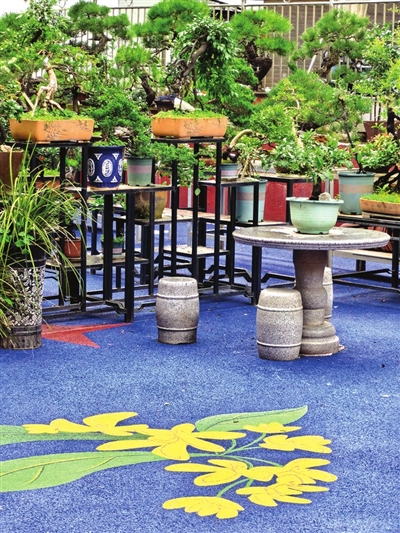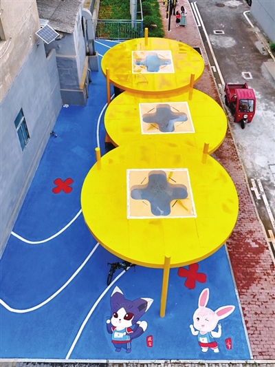 在该小区一处广场上,咸宁的吉祥物“咸宝”和“小宁”,以及市花桂花的形象跃然其上,它们与蓝色、黄色的主色调交相辉映,构成了令人赏心悦目的画面。在黄色桂花造型的遮阳亭内,人们正在下象棋。而在另一处广场,色彩斑斓,上面有多种健身器材,还有摆满盆景的共享花园。