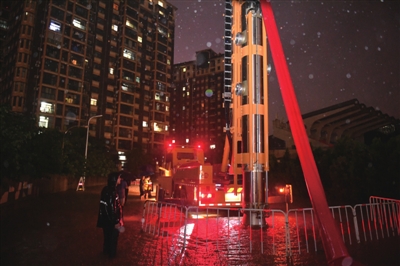 7月1日晚9时15分,市体育中心内,智能移动排水设备“龙吸水”正在全力作业,每小时排水量可达5000立方米。
