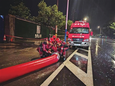 7月1日晚,因暴雨导致咸安当代云府小区附近出现深积水。市消防救援支队紧急调派大流量排涝车对此处积水进行抽排。(记者 葛利利 通讯员 刘婷 闵宏颜)
