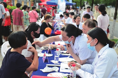 “大爷,您血压稍微偏高,平常要少吃油腻的食物,尽量控制一下就可以。”活动现场除了有血压测量、血糖监测等辅助检查,还有消化内科、内分泌科、儿科、口腔科、普外科等10多个科室的专家坐诊,对居民提出的各类健康问题提供一对一健康指导,帮助居民正确认识和应对疾病,引导居民养成良好、健康的生活习惯。来自中医科的专家团队为社区居民讲解中医养生知识,现场教授传统健身操八段锦,开展耳穴压豆、拔罐、针灸等特色中医活动,弘扬中医养生文化,让居民亲身体验中医文化的博大精深。