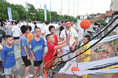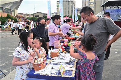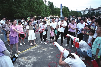 “野狼队加油、 猎豹队加油……”厨艺大赛刚结束,运动会上就响起阵阵加油声,拔河比赛中,队员们倾尽全力,双方队员在热烈的掌声中握紧绳索,身体后倾,双腿牢牢蹬住地面,全力以赴地拉扯着绳子;套大鹅亲子活动最吸引眼球,30组家庭在互相配合下,进一步增进了亲子关系;社区文明集市活动中,手工小饰品、闲置物品交换、课外书、玩具等琳琅满目,引得络绎不绝的市民驻足观看。