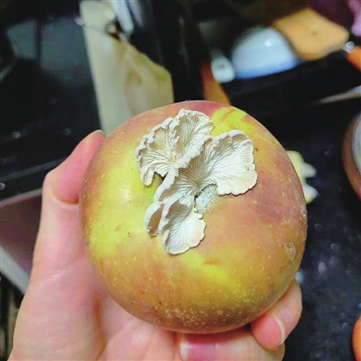 “蘑菇长得挺好看,像把小扇子,还有波浪纹,用手轻轻碰了一下,硬度跟平时吃的白蘑菇差不多。”邓女士说,因为担心蘑菇有毒,自己也没敢多摸。在给女儿和老公看过之后,全家人都感叹神奇,一时舍不得立马扔,她便把这只长着“高颜值”蘑菇的苹果暂时放到了厨房窗台上。
