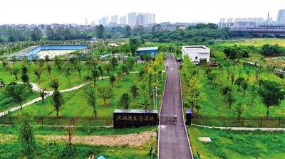 该生态滤池的部分过滤设备,建设在地下。无人机拍摄下的整个滨湖港生态滤池,草木青青,像一个公园。其中一个大池中,管理人员专门培育的几片水葫芦,用作净化水质。