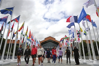 三年前因为疫情原因,东京奥运会取消了欢迎各个代表团的升旗仪式,巴黎这次延续了东京模式。没有欢迎仪式也就没有升旗广场,巴黎奥运村把各个代表团的旗帜放到了大餐厅的入口。运动员就餐前,会穿过200多面旗帜打造的“走廊”,看上去并不乏仪式感。