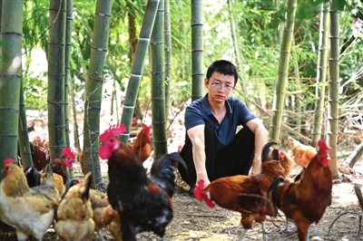 今年36岁的黄朝军是一位回乡创业的大学生,他靠自己勤劳的双手和永不言败的决心,依托山地资源优势,发展起了生态散养鸡,探出了一条致富路,被当地人称为“鸡大王”。