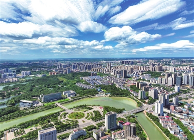 7月29日,雨后初霁,咸宁的天空变得湛蓝通透。透过无人机视角从高空俯瞰,朵朵白云飘在蔚蓝的天空中,清澈的淦河静静流淌,山水园林美景尽收眼底。 (记者 毛亚轩 赵忠志)