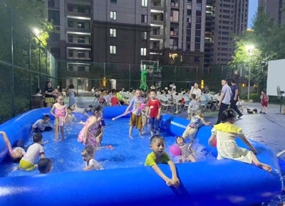 活动现场首先播放了“防溺水安全知识”与“反诈骗”系列短片,向社区居民普及安全常识,增强居民自我保护意识和能力。随后,电影《大圣归来》的放映,为广场增添了欢声笑语。部分孩子们则在中心广场一侧的充气游泳池中嬉戏玩耍。此外,物业工作人员还在活动现场设置了套圈圈、海绵大作战、揪尾巴等趣味游戏,同时为居民准备了酸梅汤、绿豆汤等解暑食品,供大家免费品尝。