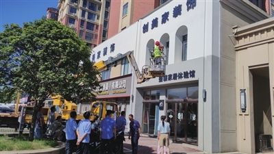 此次拆除的5块户外广告设施主要分布于嘉鱼大道、方逢时路和小新堤路,其中1处为高空字体广告,1处为墙面一店多招,另外3处为破损店招。实施拆除前,执法队员与商户充分沟通协调,获得了商户的理解与支持。拆除中,执法队委托专业的施工队伍,并引导疏散行人注意避让,确保施工安全有序。店招拆除后,工作人员及时清扫、清运拆除的垃圾,确保现场干净整洁。