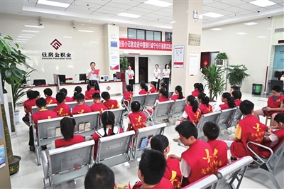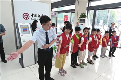 在银行大堂,中行工作人员首先带领小记者们参观银行大厅,了解银行的功能分区和岗位设置,并组织小记者们分组依次认识和体验ATM机、自助发卡机等智能化银行设备。
