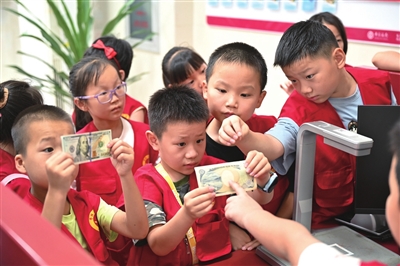 当一组小记者在参观银行大堂设备时,另一组小记者正在理财经理的组织下学习认识外币、体验存取款等方面的金融常识,一堂别开生面的金融启蒙课让大家兴致勃勃。