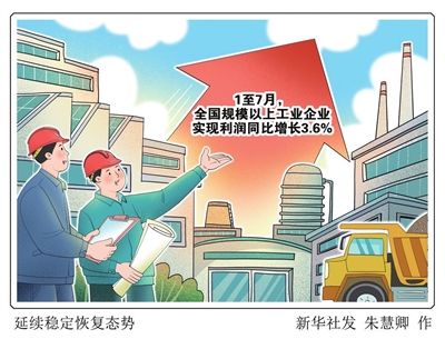 新华网消息 国家统计局27日发布的数据显示,1至7月,全国规模以上工业企业实现利润总额40991.7亿元,同比增长3.6%,比1至6月份加快0.1个百分点,延续稳定恢复态势。