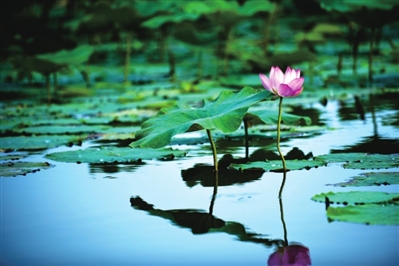 阳光直直地洒在湖面上,反射出耀眼的光芒。荷叶更显翠绿,密密麻麻铺满整片荷塘,有些漂浮碧波上,流转着满盘圆润;有些秀挺半空中,撑起一伞潇洒。荷花娇艳欲滴,展露嫩黄的小花蕊,开了一半的透出可爱的笑脸,花骨朵们则饱胀得似成熟的红苹果。一阵风来,荷叶轻舞,荷花婀娜。优美绝伦的景致让我忘记了中午的慵懒与倦怠,深深呼吸,独自享受荷塘边的诗情画意。