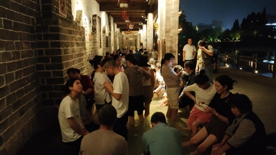 随着气温持续走低,温泉游人气迅速攀升。10月13日,记者在市区月亮湾濯足廊看到,前来泡脚的游客和市民络绎不绝,人们一边赏灯光秀,一边聊着天泡着温泉好不惬意。 记者 赵忠志