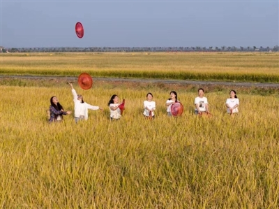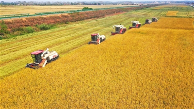 10月10日,无人机镜头下的咸安区向阳湖现代农业科技示范区,田成方、路成网、渠相连,8200亩连片的水稻正值收割季,一台台收割机井然有序地开展机收作业。眼下,我市130余万亩中稻迎来收获期,中稻产量约占全市秋粮产量的七成。