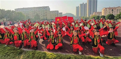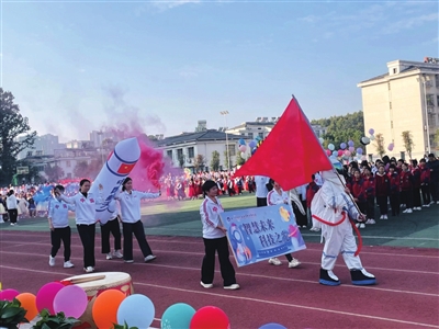 运动会入场式精彩纷呈,国旗队、校旗队身姿挺拔,还有家长代表队步履铿锵。六个年级41个班级也将各种元素融入方阵中,口号响亮,队形多变。现场还有活力四射的拉拉操、夺人眼球的武术表演、韵味悠长的古典舞蹈等节目,展示着师生的创意与才华。