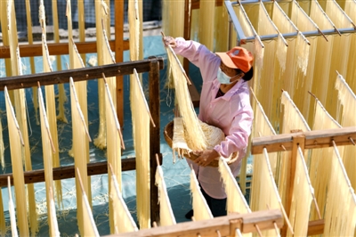 11月14日,通城县五里镇左港村村民正在加工、晾晒面条。近年来,该镇积极引导村民根据自身实际情况和市场需求选择经营模式,投身农副产品加工、特色手工艺等特色产业,实现家门口增收致富,成为乡村振兴的“微引擎”。