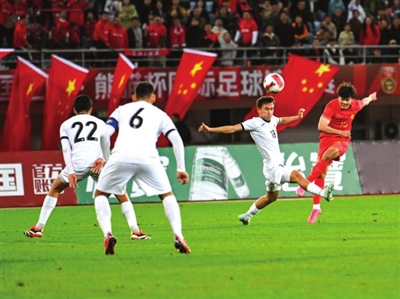 当晚,中国队对阵吉尔吉斯斯坦队的比赛在成都双流体育中心打响。比赛开始后,中国队占据场上主动,但在对手顽强的防守下并未获得太多良机。第39分钟,大多数时间处于防守态势的吉尔吉斯斯坦队打出反击,边路经一系列配合后,将球快速扫到中国队禁区,中国队球员贺一然倒地解围,却不慎自摆乌龙,中国队0:1落后。